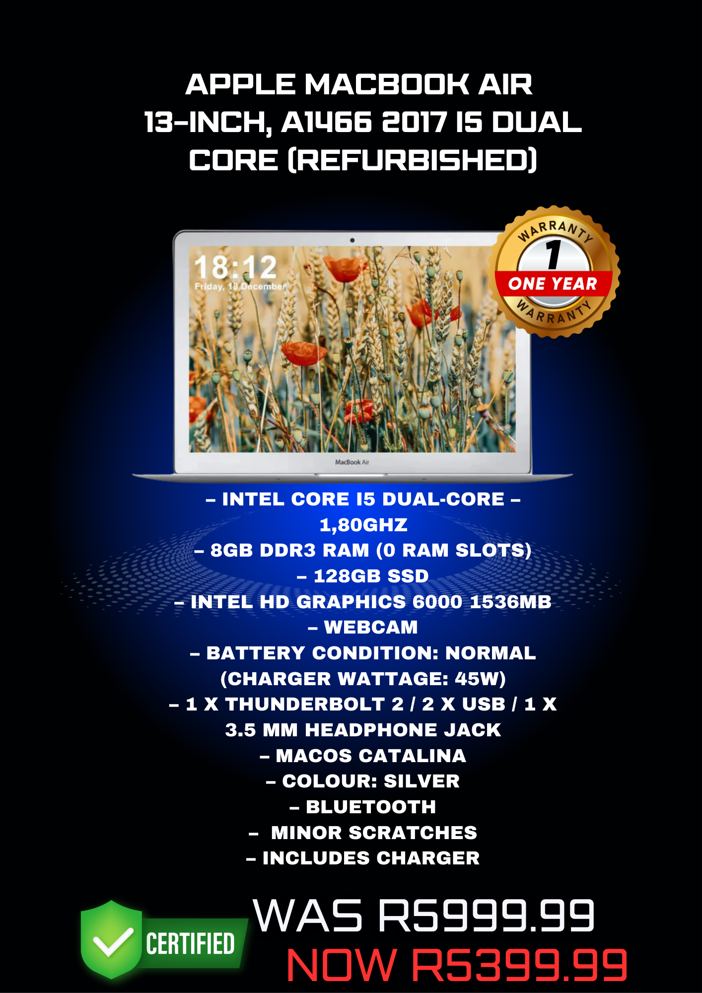 Apple MacBook Air 13-Inch, A1466 2017 i5 Dual Core (Refurbished) Original price was: R5,999.99.R5,399.99Current price is: R5,399.99.